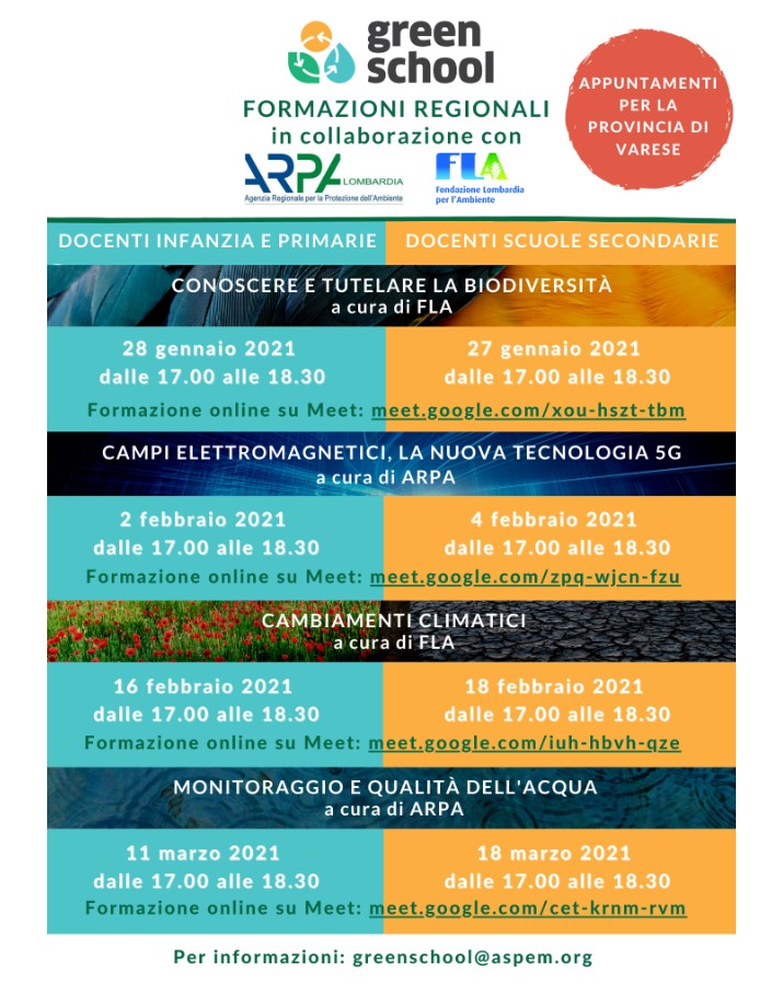 Si informano i docenti interessati che Green School Varese propone la partecipazione ad alcuni eventi di formazione-aggiornamento relativi a diversi aspetti della sostenibilità ambientale. Si riportano, di seguito, le date e i link per informazioni ed iscrizioni: